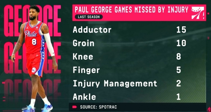 在2024-25赛季,乔治因伤病缺席了41场比赛: