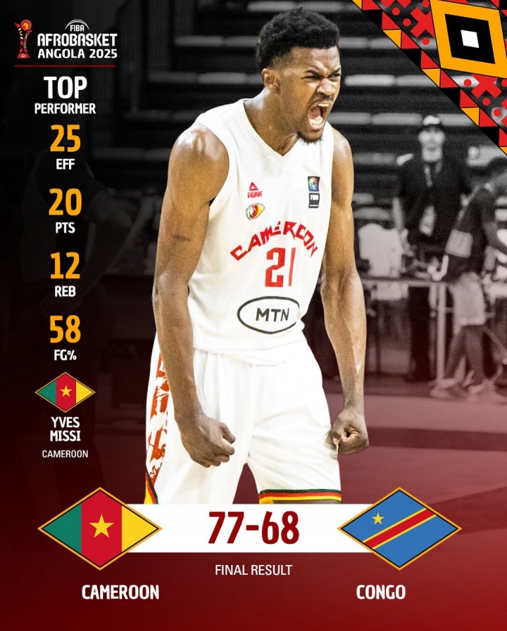 08月20日讯 2025年男篮非锦赛1/4决赛资格赛,喀麦隆男篮以77-68淘汰刚果(金),杀进八强将对阵埃及男篮。